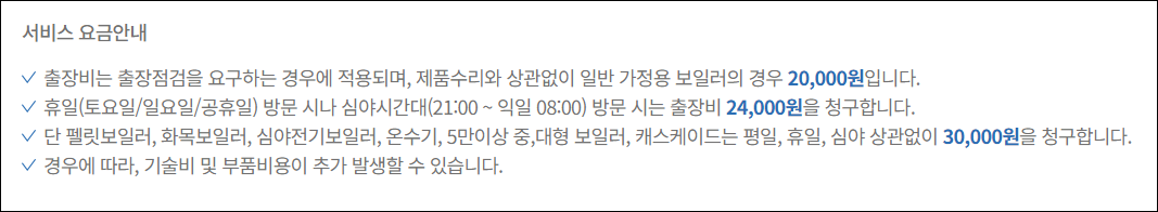 지금의 출장비는 출장점검을 요구하는 경우에 적용되며, 제품수리와 상관없이 일반 가정용 보일러의 경우 20,000원입니다.