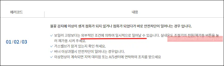 그러나 01/02/03이라는 에러 코드가 출력되었다고 무조건 보일러 점화가 되지 않았다고 보기는 어렵습니다.