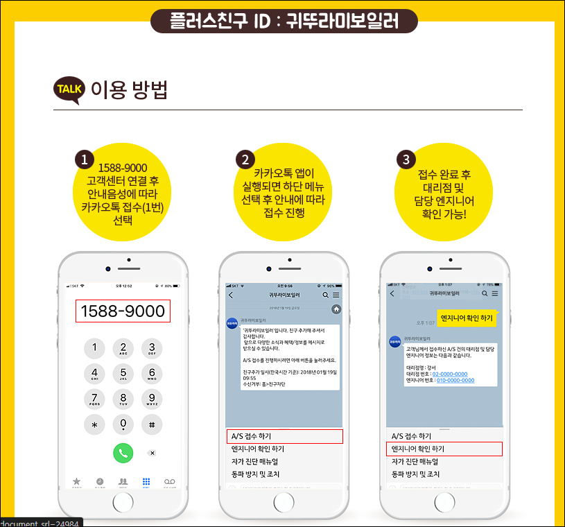 온라인 서비스 신청이 불편한 분들은 휴대폰에 누구나 깔려있는 카톡을 이용해서 AS 신청할 수도 있어요.