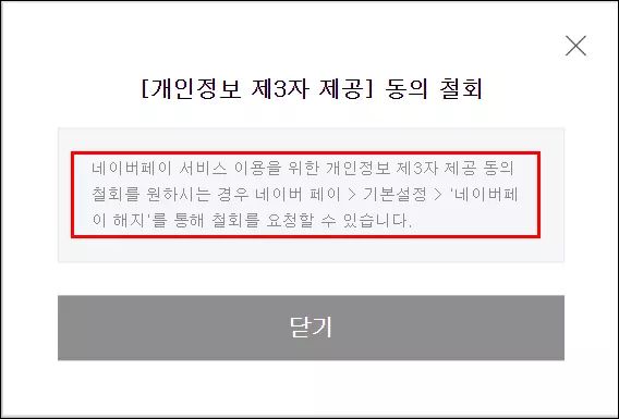 "개인정보 동의 철회를 원하시는 경우 네이버 페이 기본 설정 네이버 페이 해지를 통해 철회를 요청할 수 있습니다."