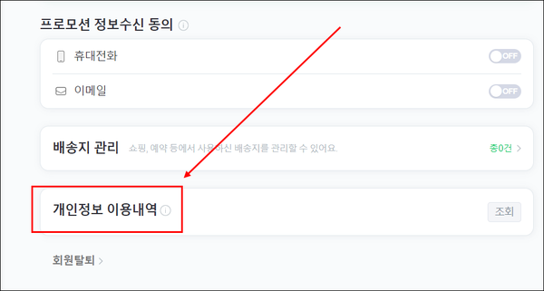 마우스 스크롤 조금 내리면 화면 오른쪽 하단 즈음에 개인정보 이용 내역이 나옵니다.